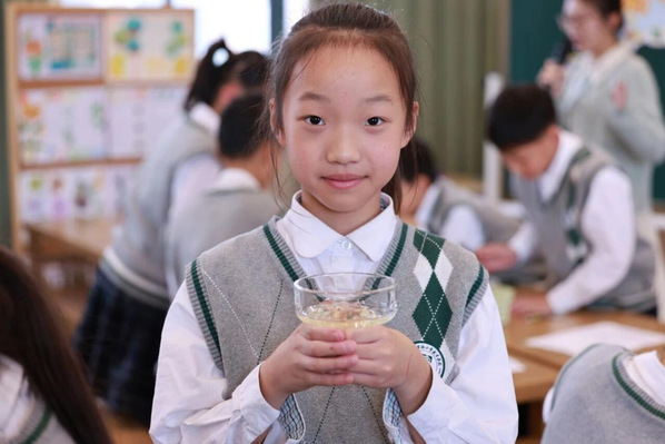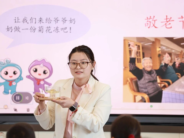 李琳、张嘉宁两位老师携手引领四年级劳动+美术融合课《菊韵飘香》。李老师为学生介绍了菊花的功效,以及菊花冻的制作方法,并带领学生从“色、香、味”等方面观察菊花冻。张老师通过图片演示等环节向同学们详细地展示了绘制菊花冻说明卡的方法。本节融合课将劳动与美术创意融合,让孩子们在动手实践中了解地方特色菊韵文化,感受美术创造的乐趣。