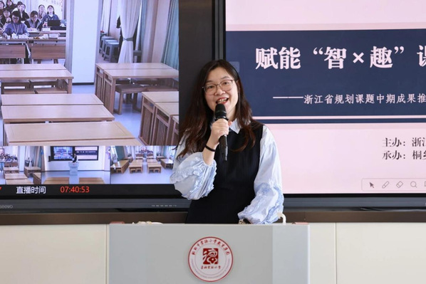 桐乡市崇福实验小学书记、校长李萍介绍了《“智×趣”课堂:小学生课堂学习的变革研究》省级课题中期成果。李萍校长围绕课题核心内容,简明扼要地介绍了课题的选题缘由,研究综述、界定与愿景,研究内容与策略,以及研究进程与展望。